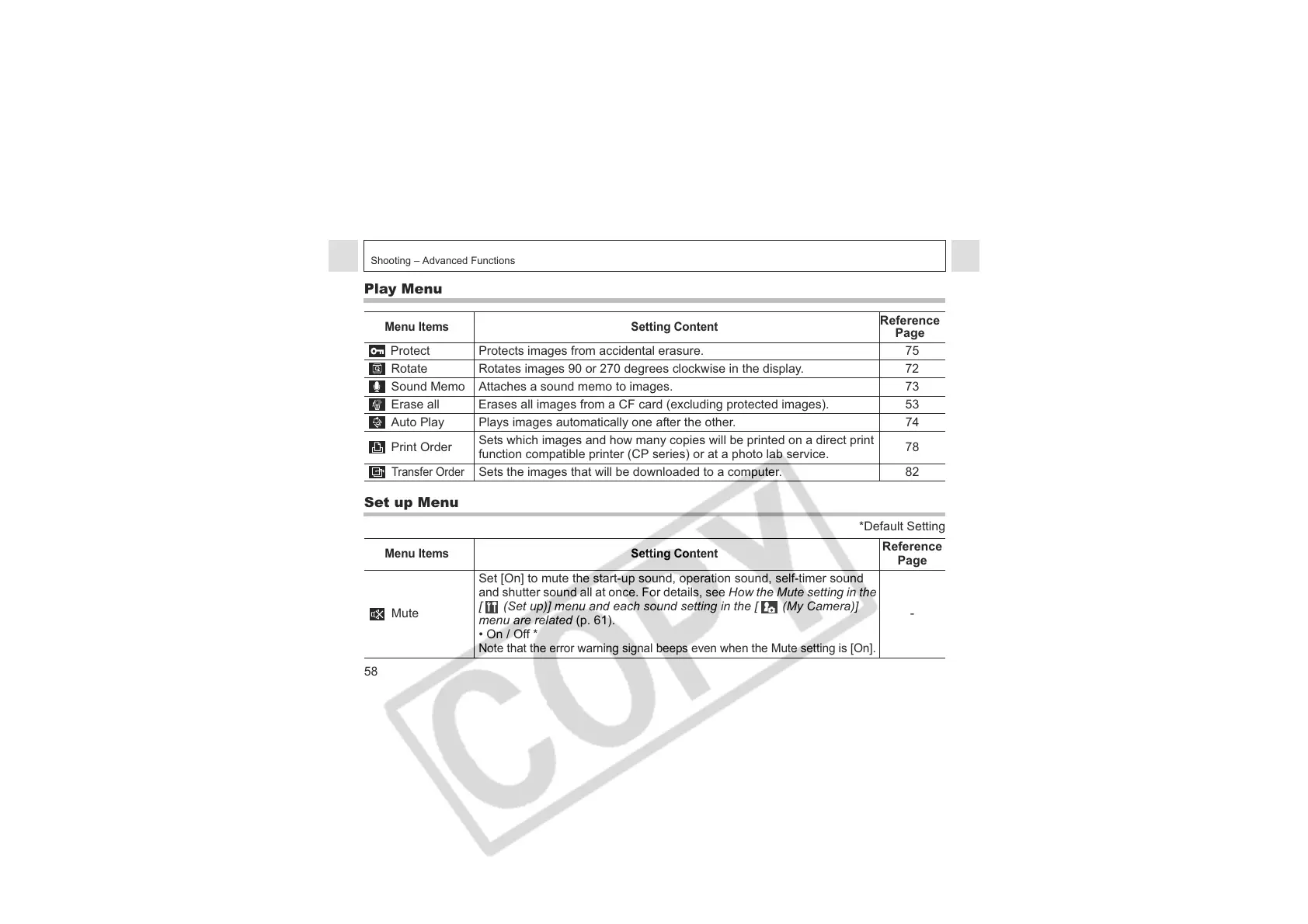 Set [On] to mute the start-up sound, operation sound, self-timer sound