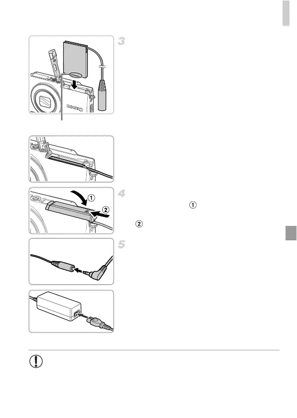 • Do not attach the adapter or adapter cord to other objects. Doing so