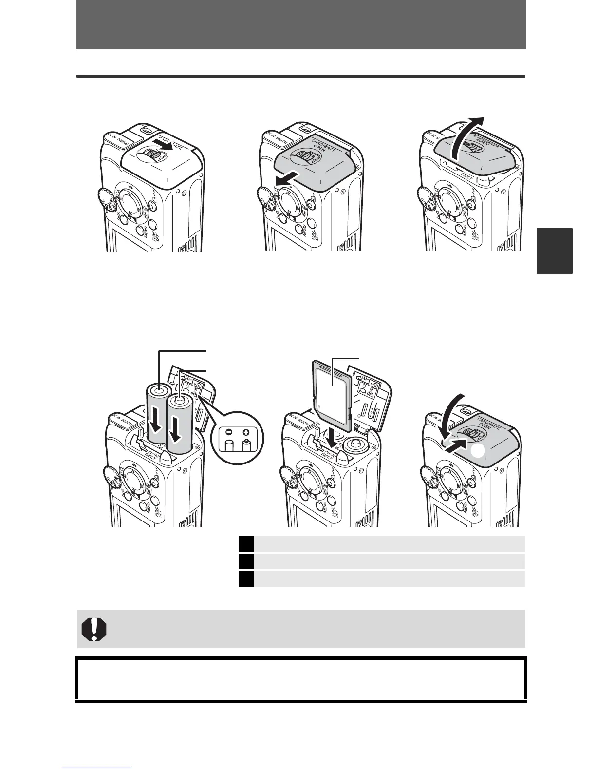 2 Insert the batteries, and insert the memory card until it clicks