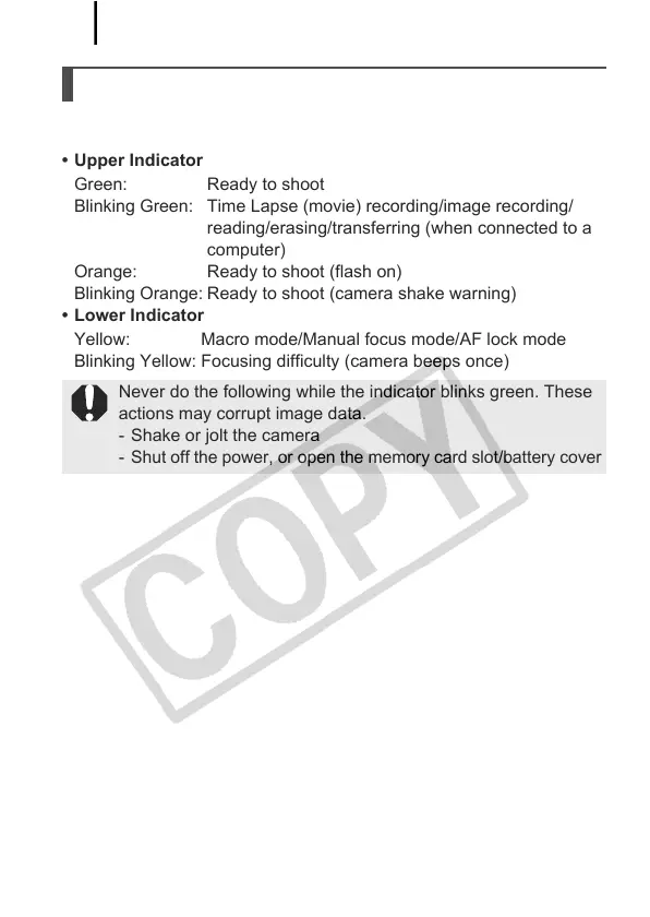 The camera indicators will light or blink under the following conditions.