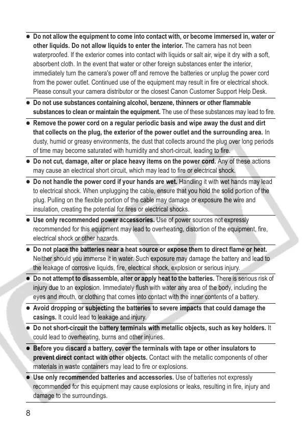 other liquids. Do not allow liquids to enter the interior. The camera has not been