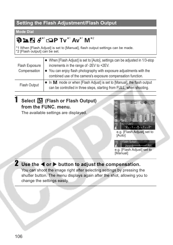 In mode or when [Flash Adjust] is set to [Manual], the flash output