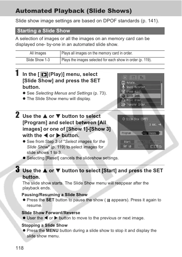 Slide Show 1-3 Plays the images selected for each show in order (p. 119).