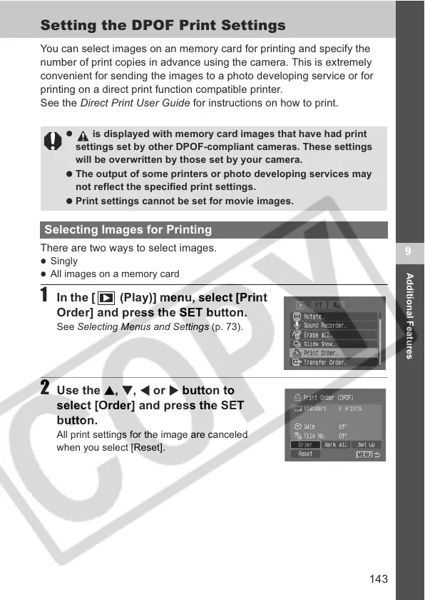 settings set by other DPOF-compliant cameras. These settings