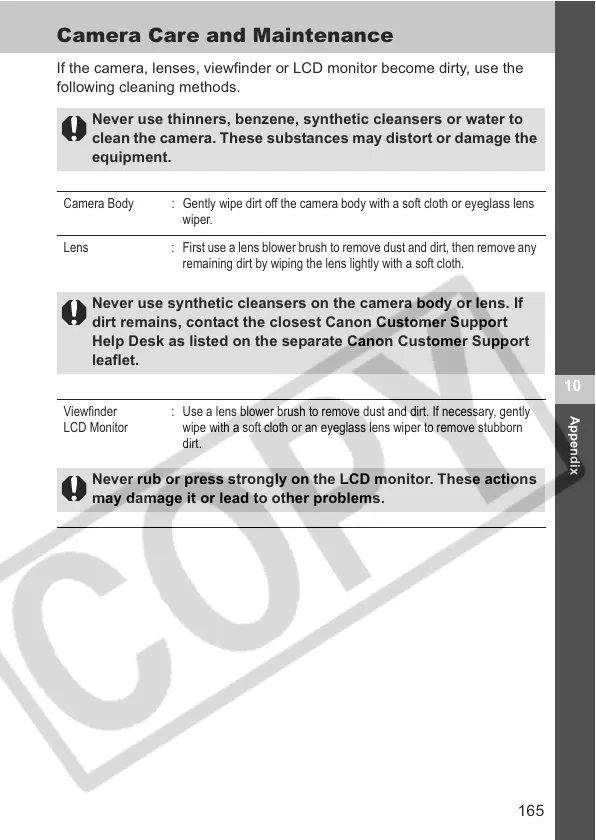 If the camera, lenses, viewfinder or LCD monitor become dirty, use the