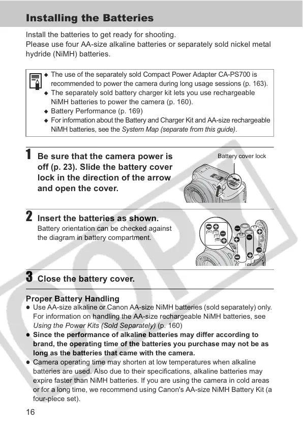 Use AA-size alkaline or Canon AA-size NiMH batteries (sold separately) only.
