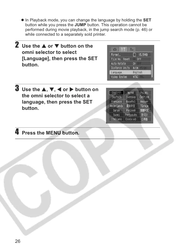 z In Playback mode, you can change the language by holding the SET