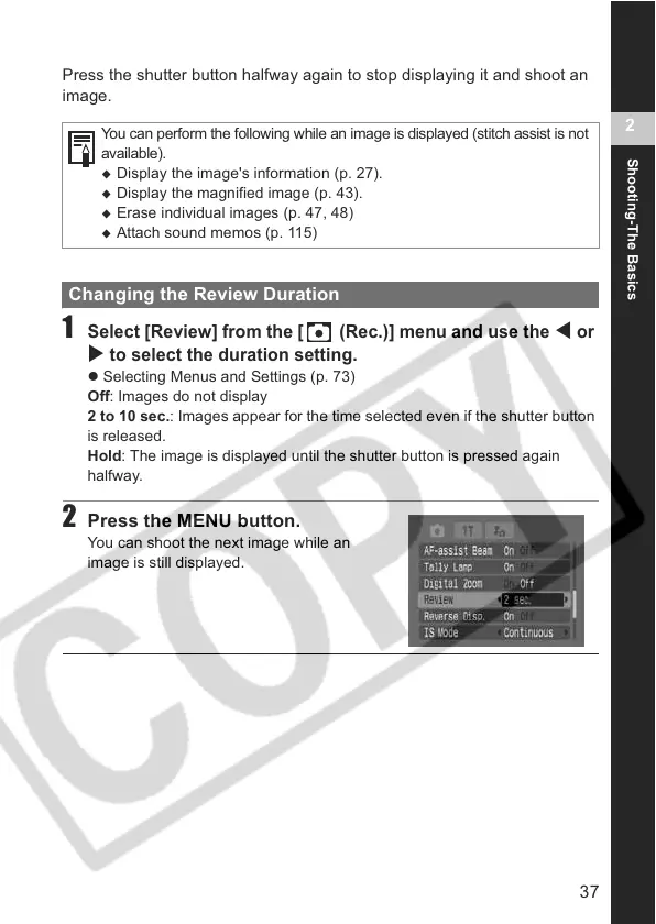 2 to 10 sec.: Images appear for the time selected even if the shutter button