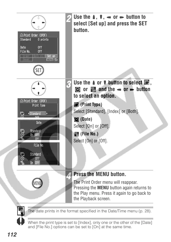The date prints in the format specified in the Date/Time menu (p. 28).