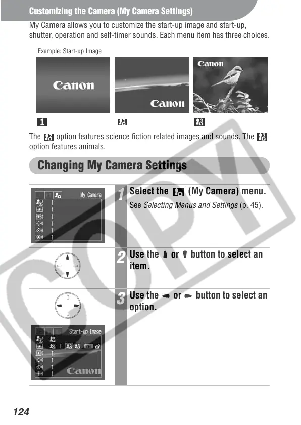 shutter, operation and self-timer sounds. Each menu item has three choices.