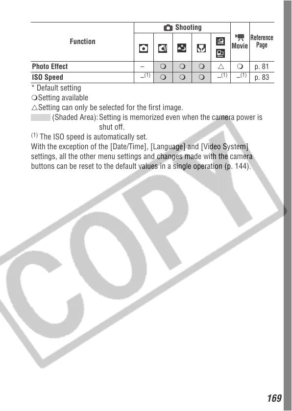 (Shaded Area): Setting is memorized even when the camera power is
