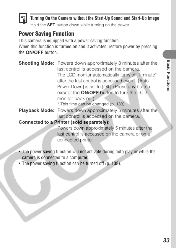 Turning On the Camera without the Start-Up Sound and Start-Up Image