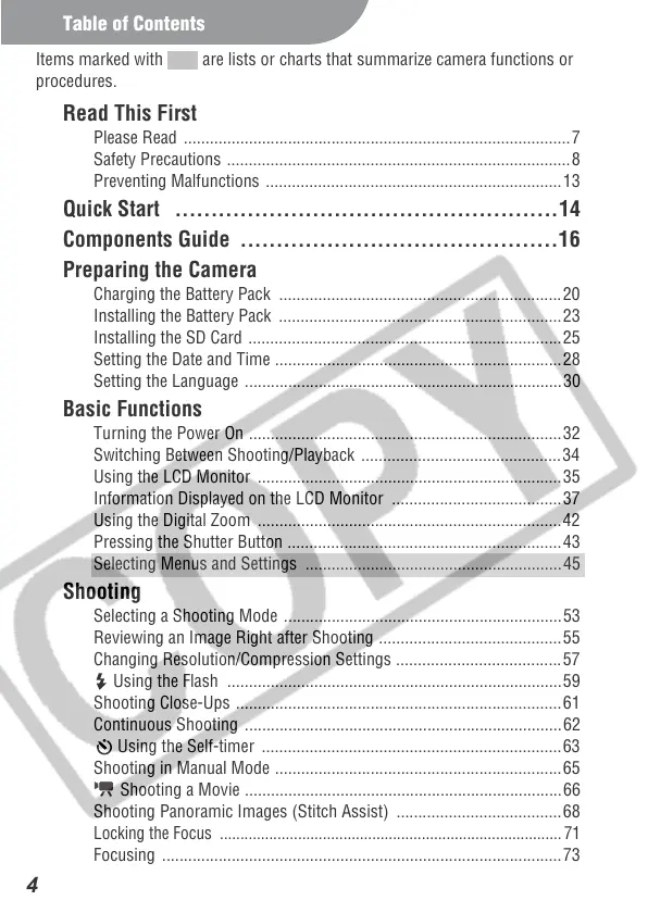 Shooting Panoramic Images (Stitch Assist) ......................................68