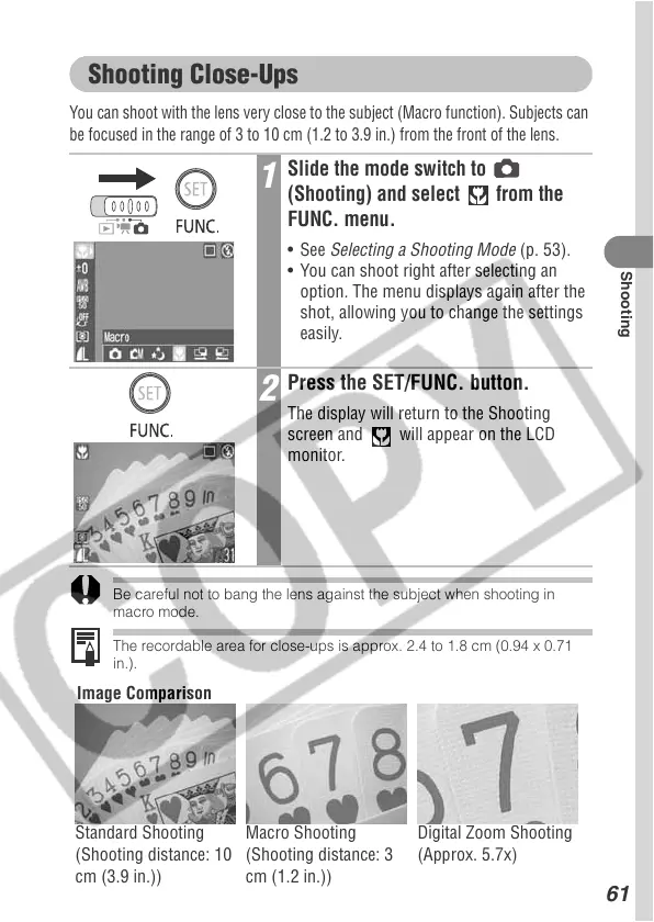 The recordable area for close-ups is approx. 2.4 to 1.8 cm (0.94 x 0.71