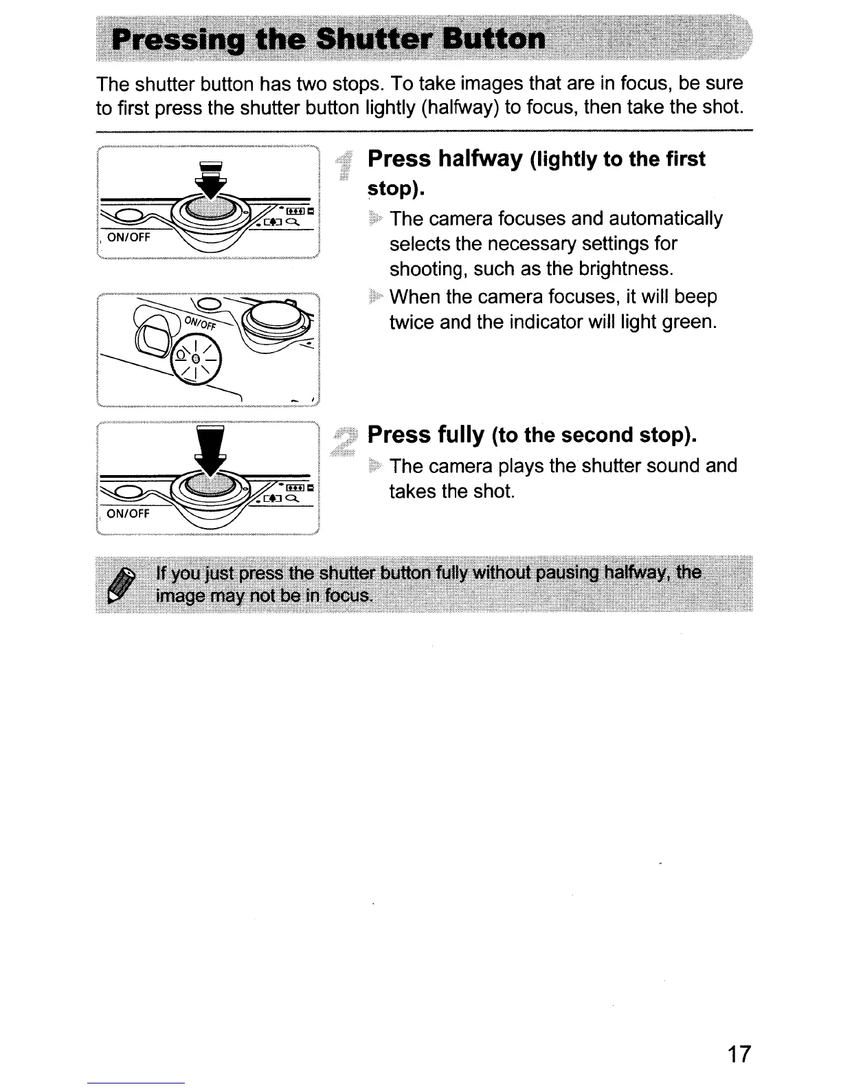 The shutter button has two stops. To take images that are