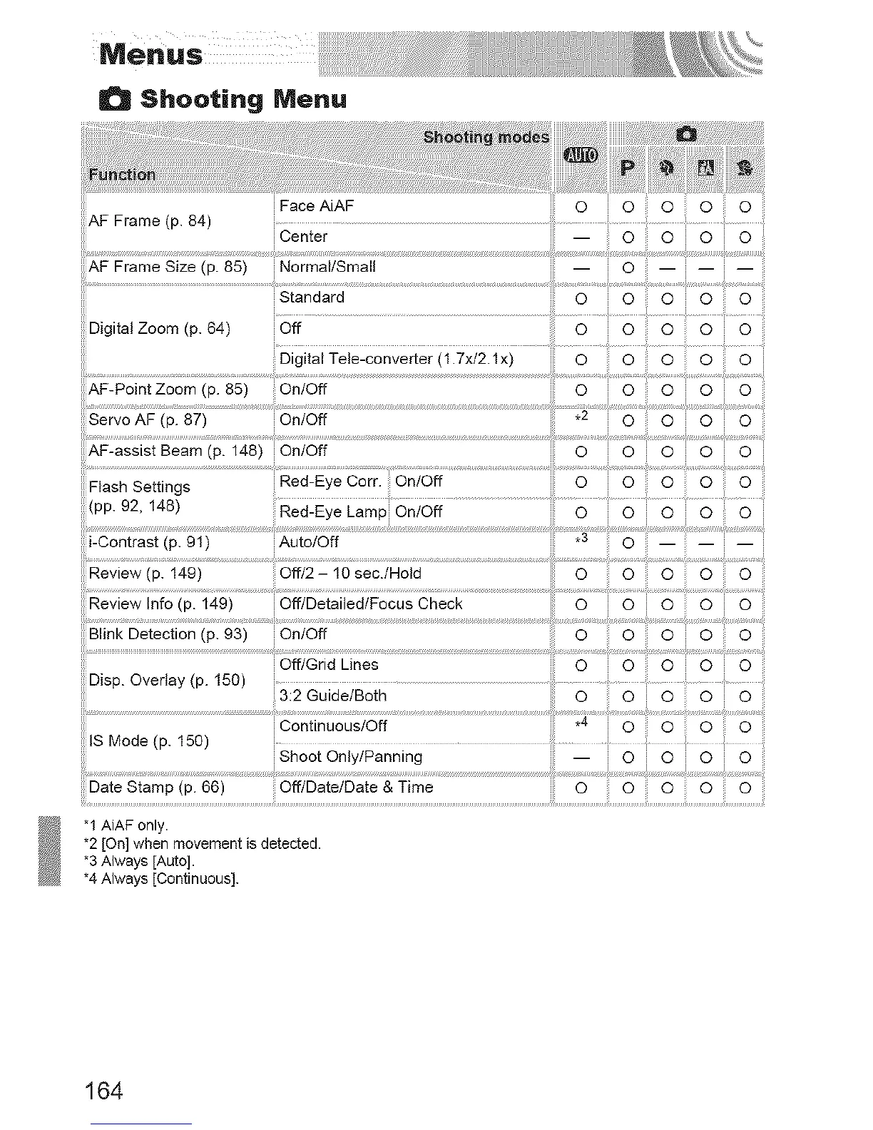 AF-Point Zoom (p. 85) On/Off O O O O O