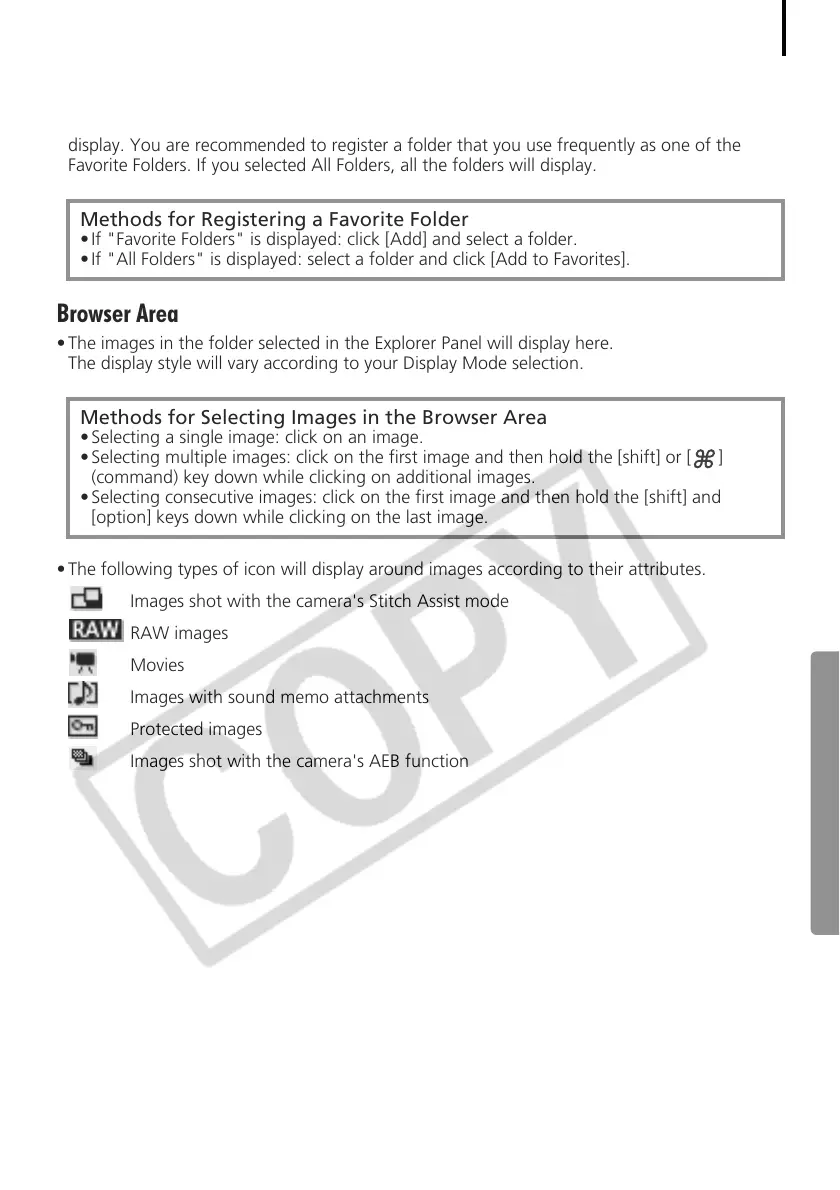 • Use this area to select folders. The images in the selected folder display in the Browser Area.