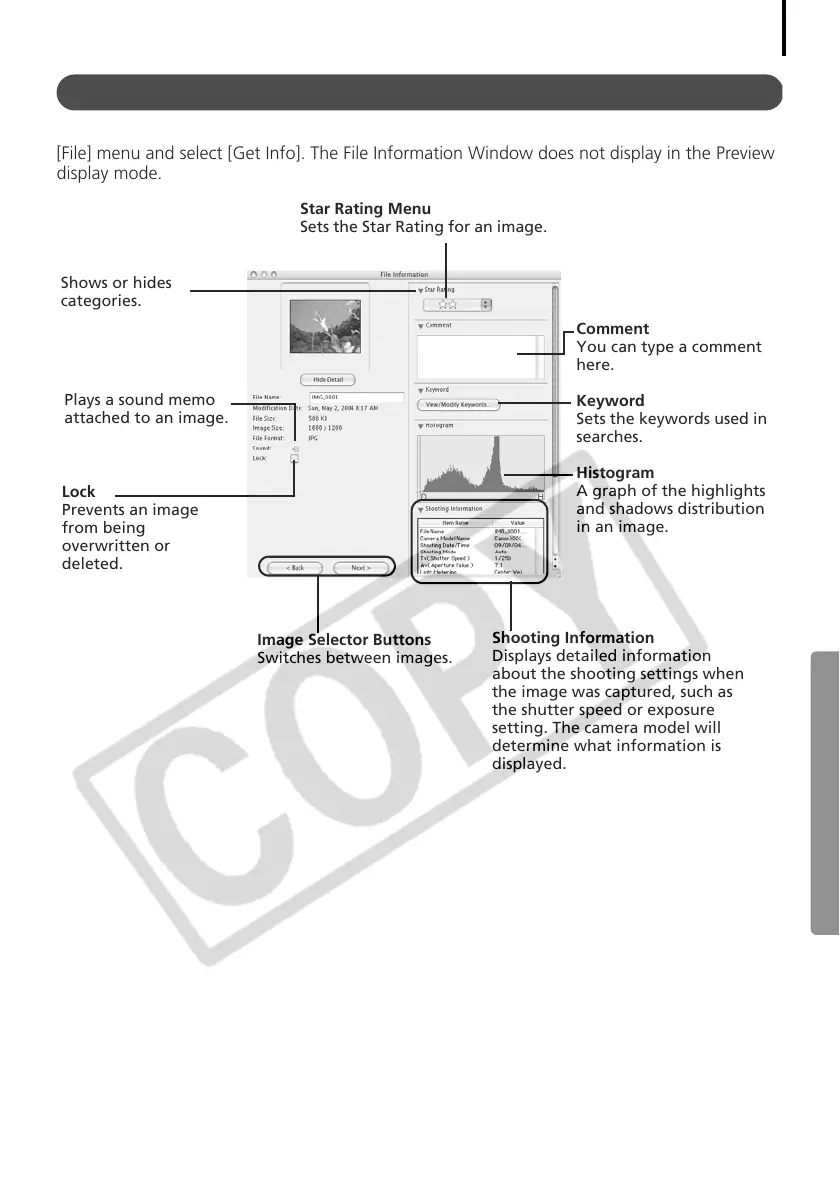 The File Information Window displays when you select an image in the Browser Area, click the