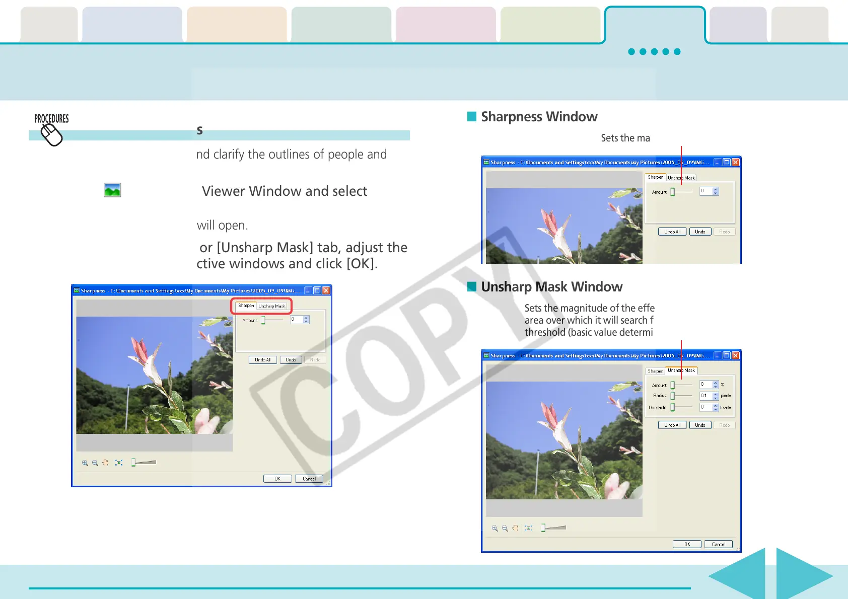 Select the [Sharpen] or [Unsharp Mask] tab, adjust the