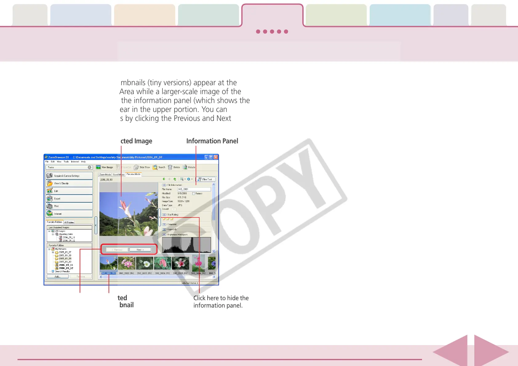 selected thumbnail and the information panel (which shows the