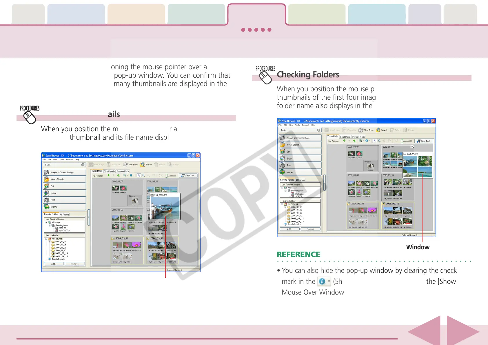 When you position the mouse pointer over a thumbnail, an