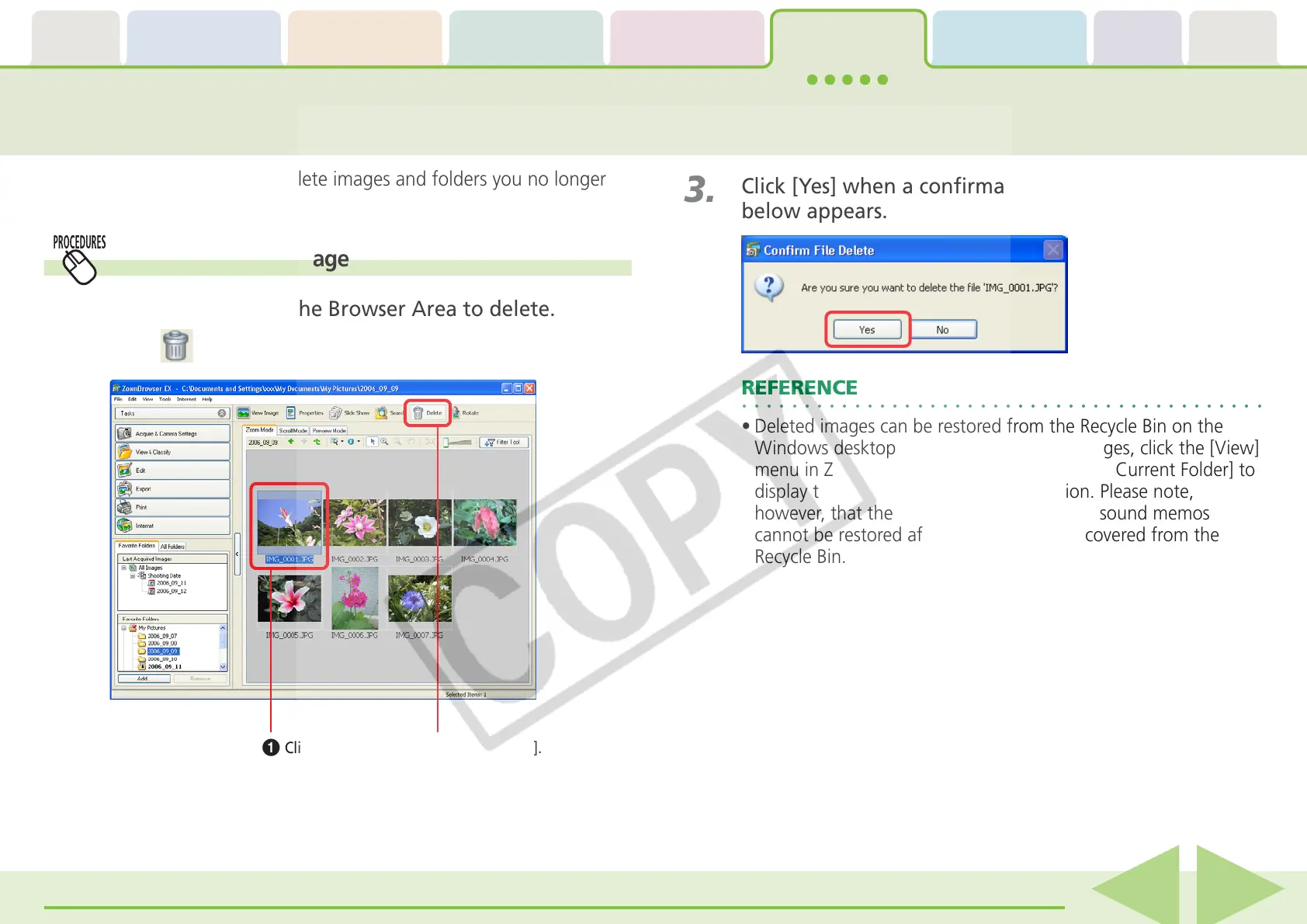 • Deleted images can be restored from the Recycle Bin on the