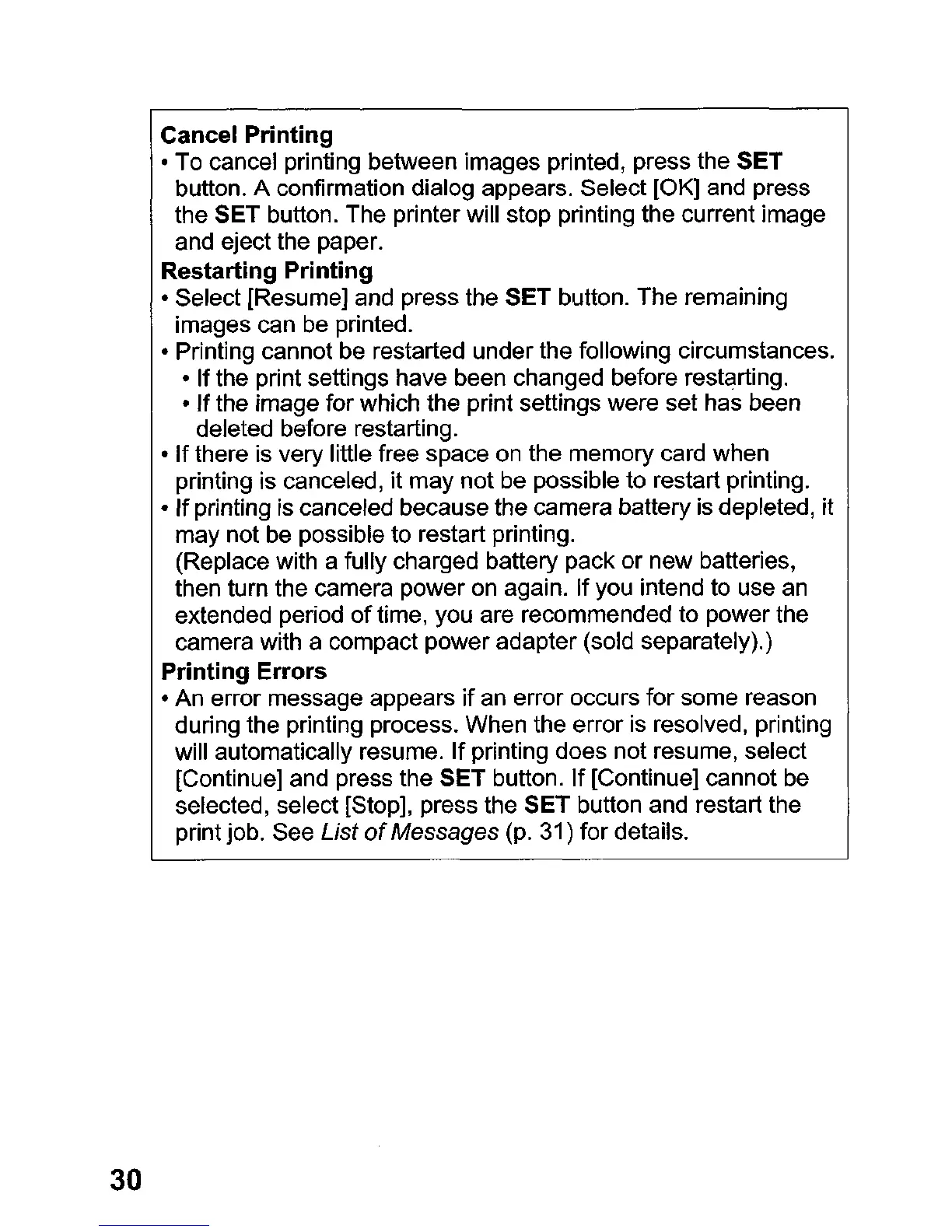 printing is canceled, it may not be possible to restart printing.