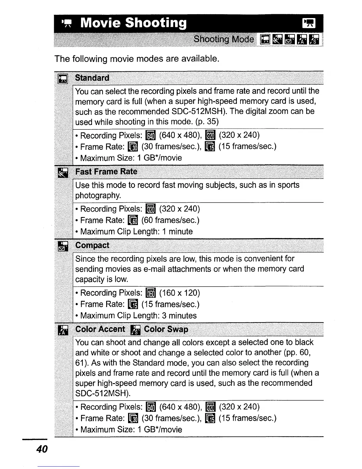 pixels and frame rate and record until the memory card is full (when a