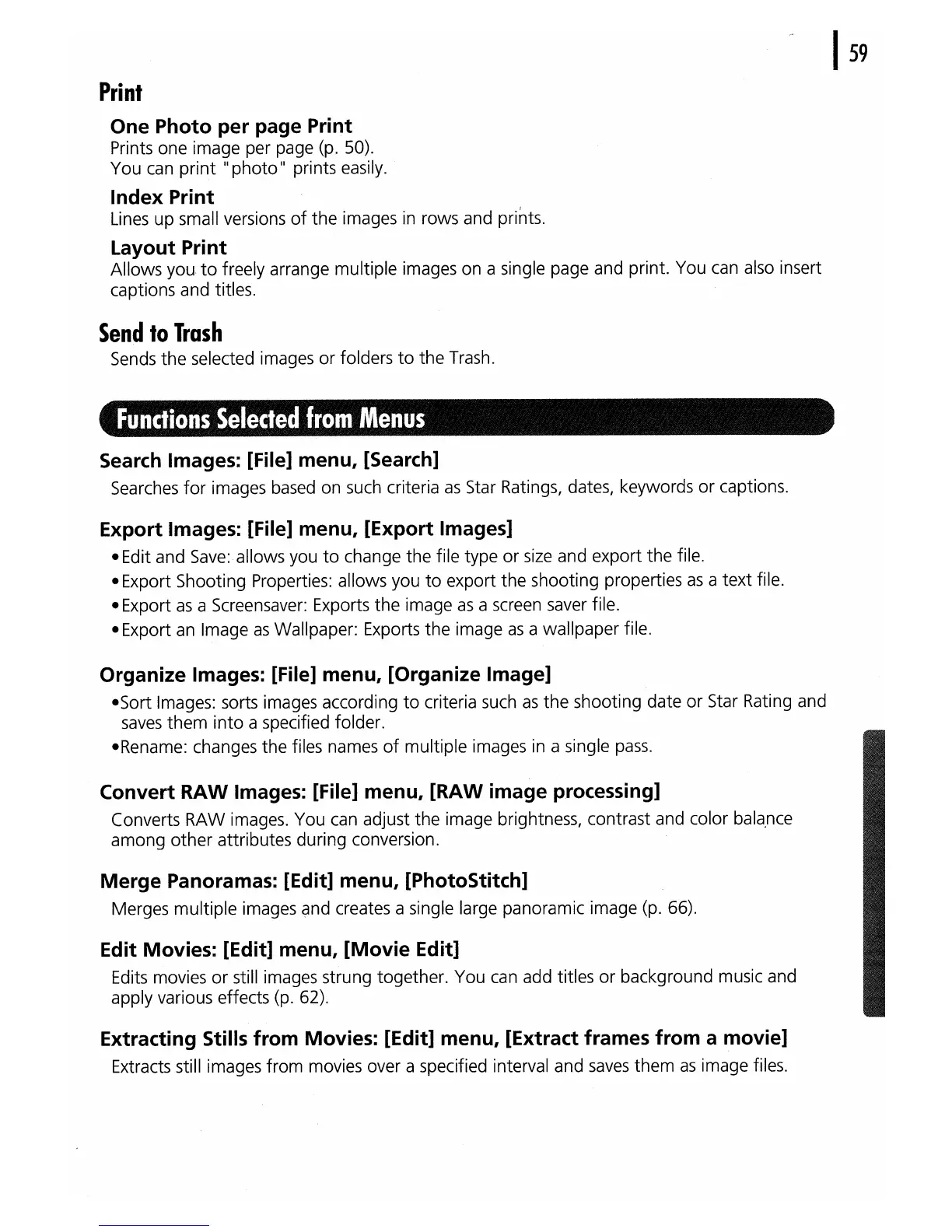 Merges multiple images and creates a single large panoramic image (p. 66).