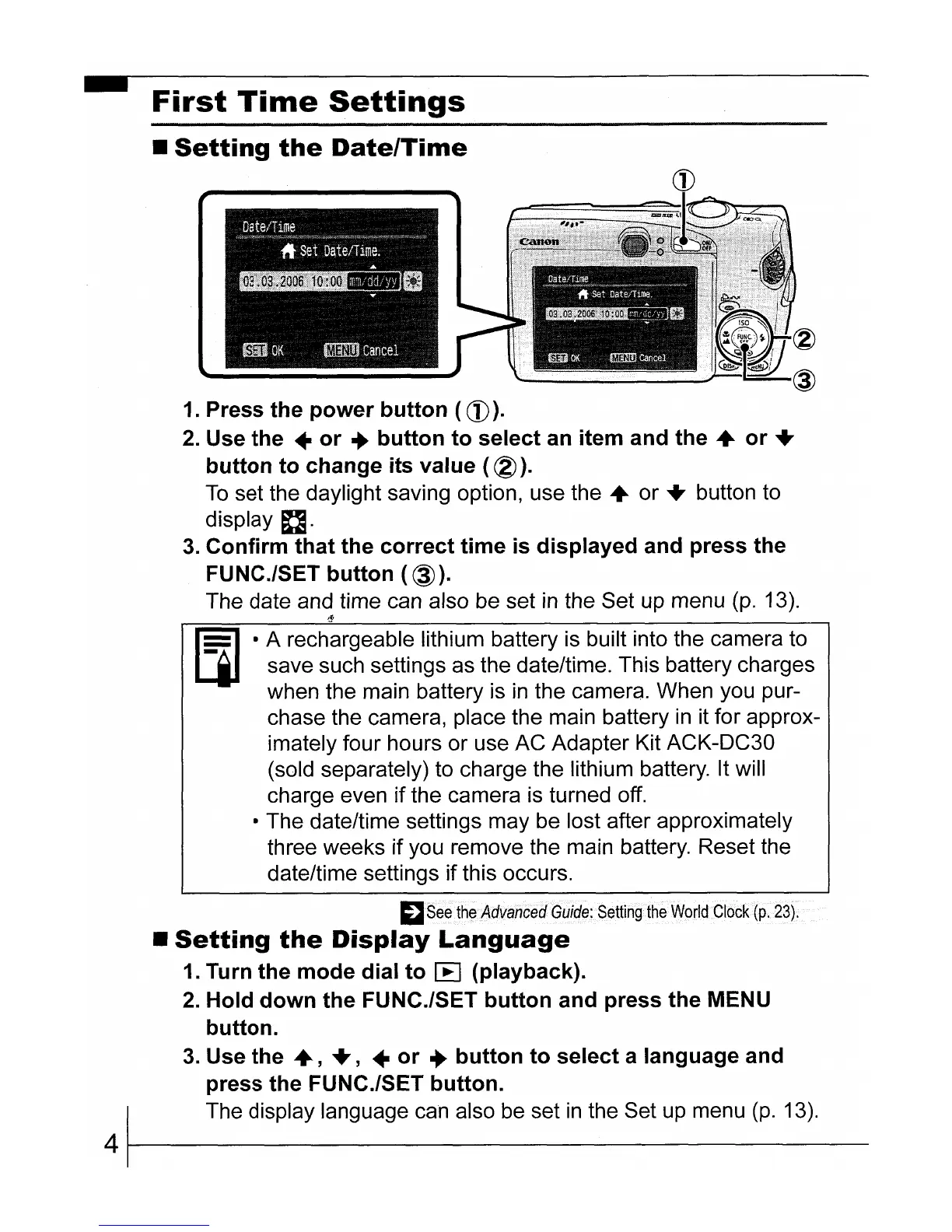 imately four hours or use AC Adapter Kit ACK-DC30