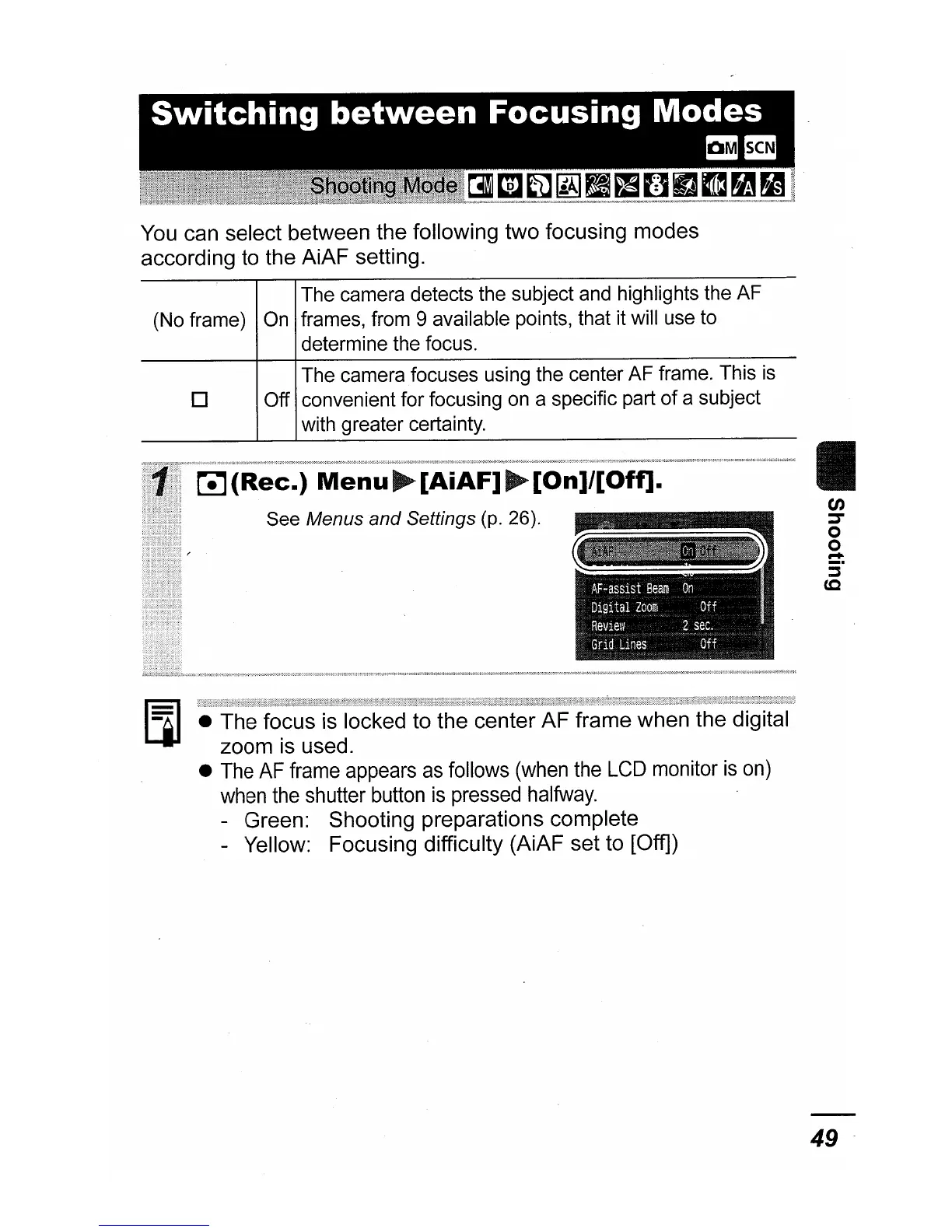- Yellow: Focusing difficulty (AiAF set to [Off])