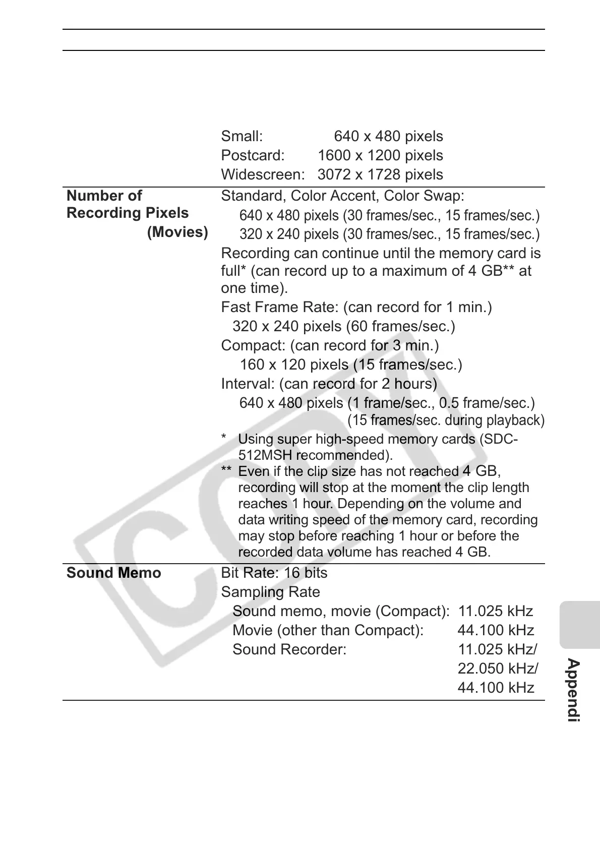 320 x 240 pixels (30 frames/sec., 15 frames/sec.)