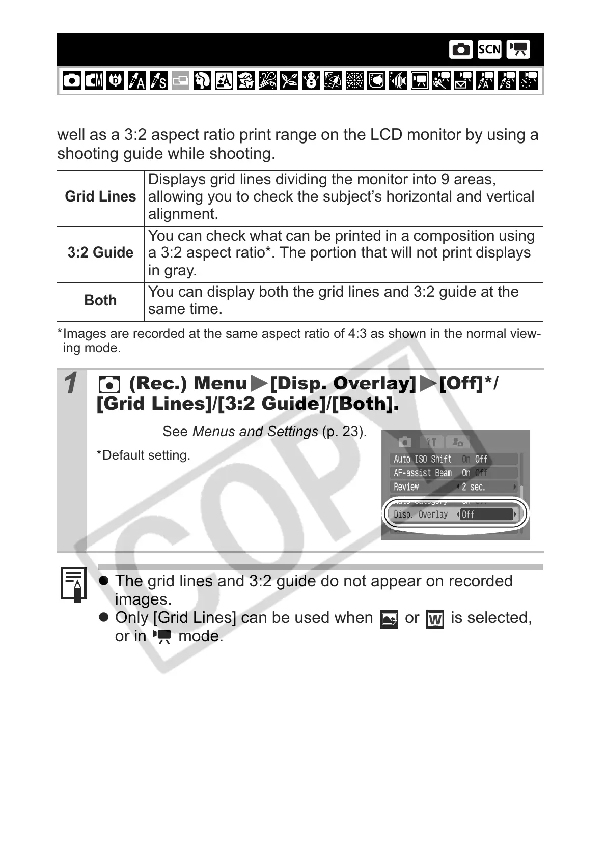 z The grid lines and 3:2 guide do not appear on recorded