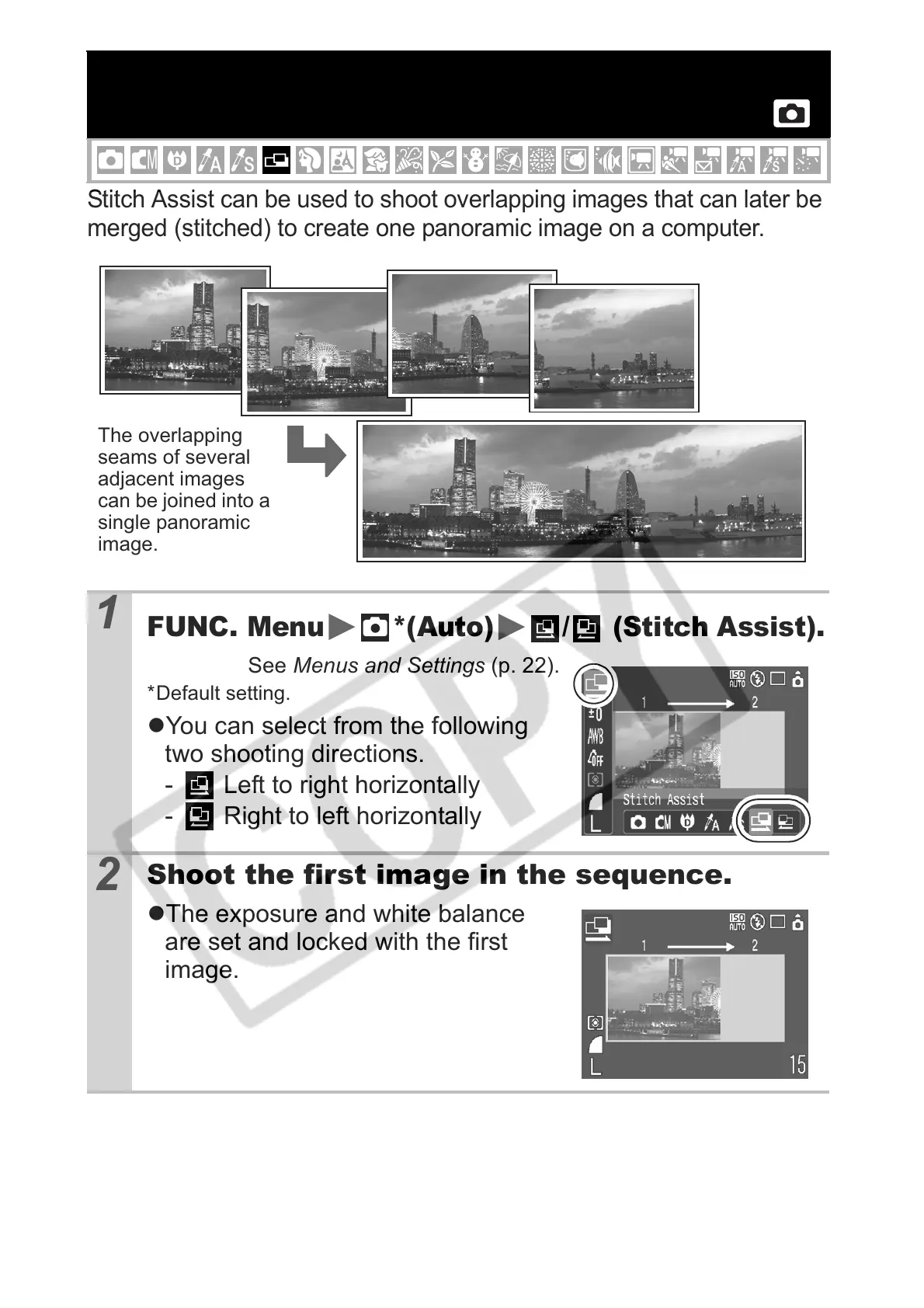 Stitch Assist can be used to shoot overlapping images that can later be