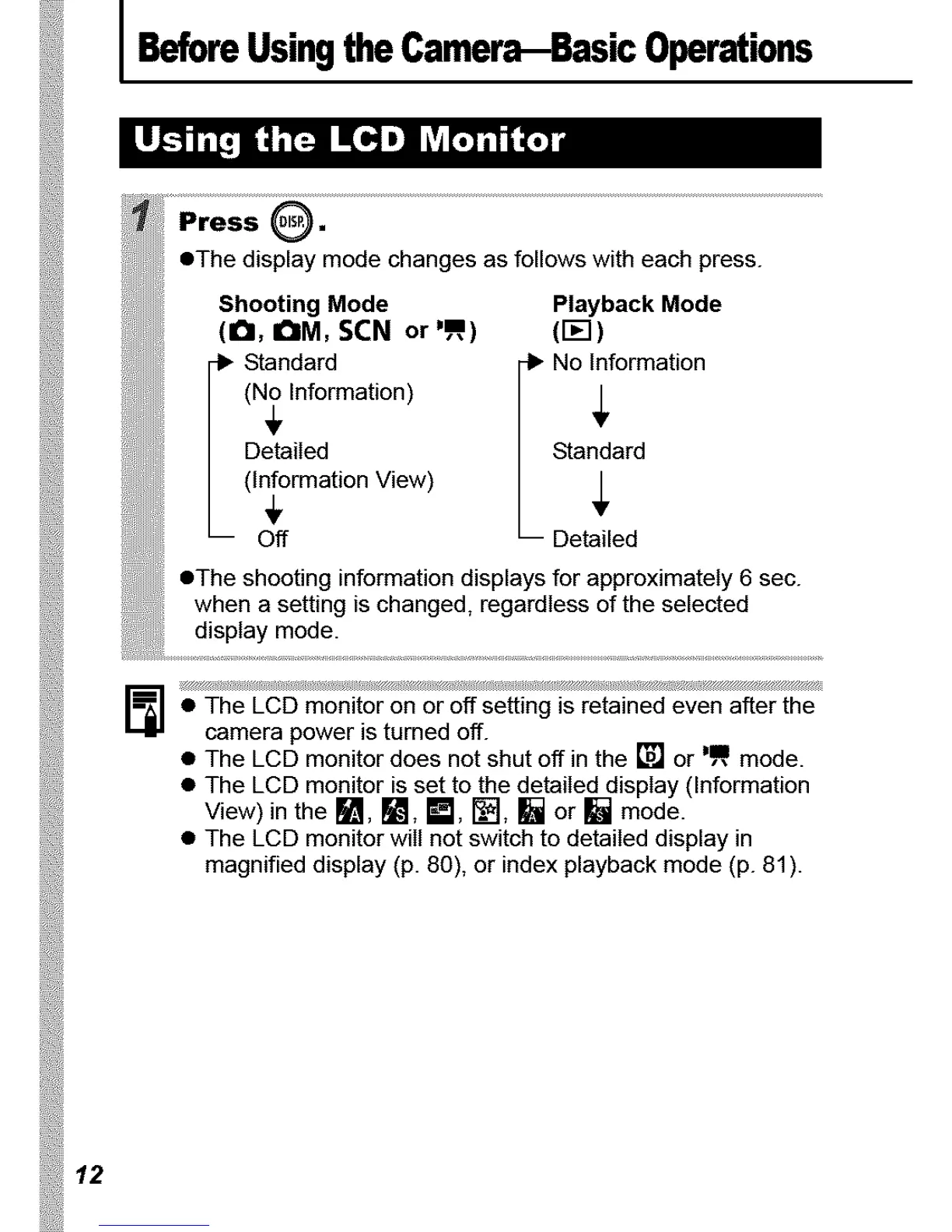 • The LCD monitor is set to the detailed display (Information