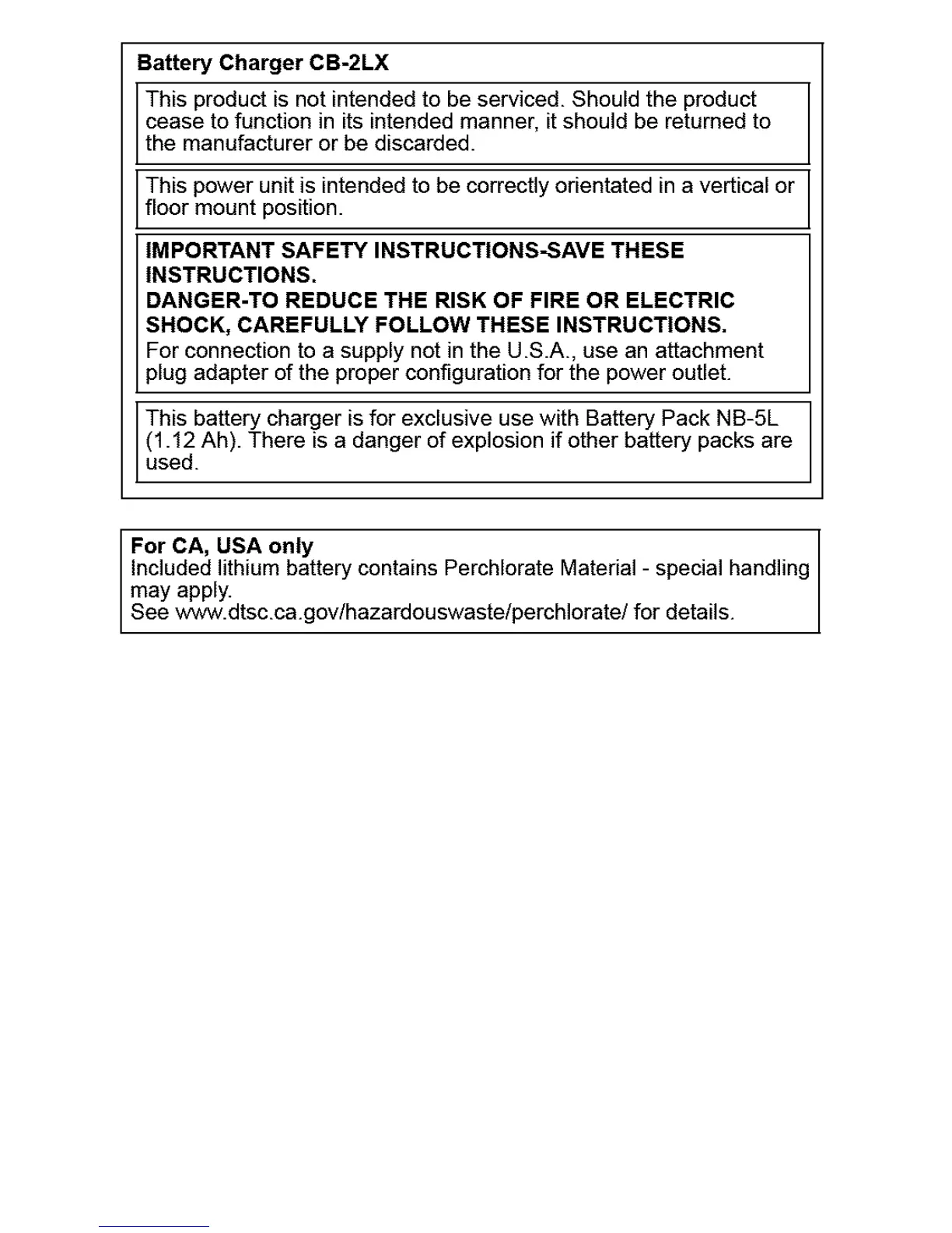 This battery charger is for exclusive use with Battery Pack NB-5L