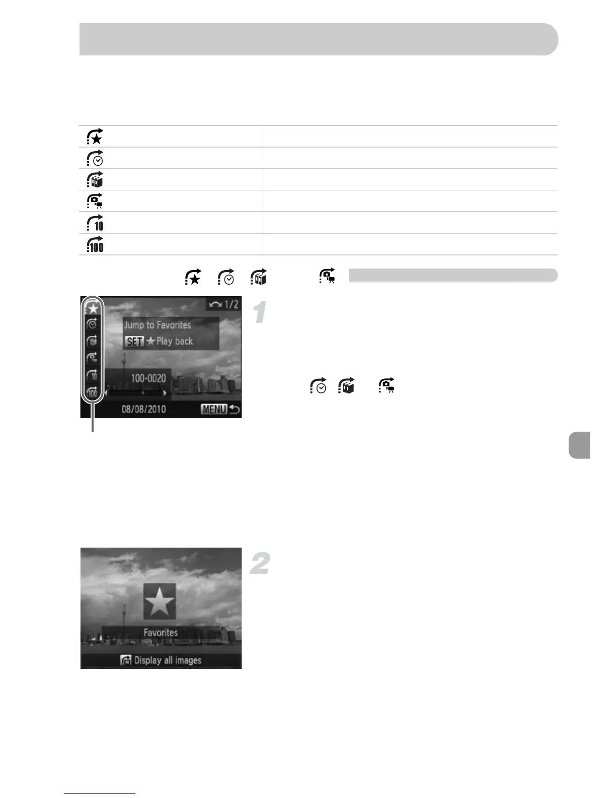 Jump to Favorites Displays images tagged as favorites (p. 124)