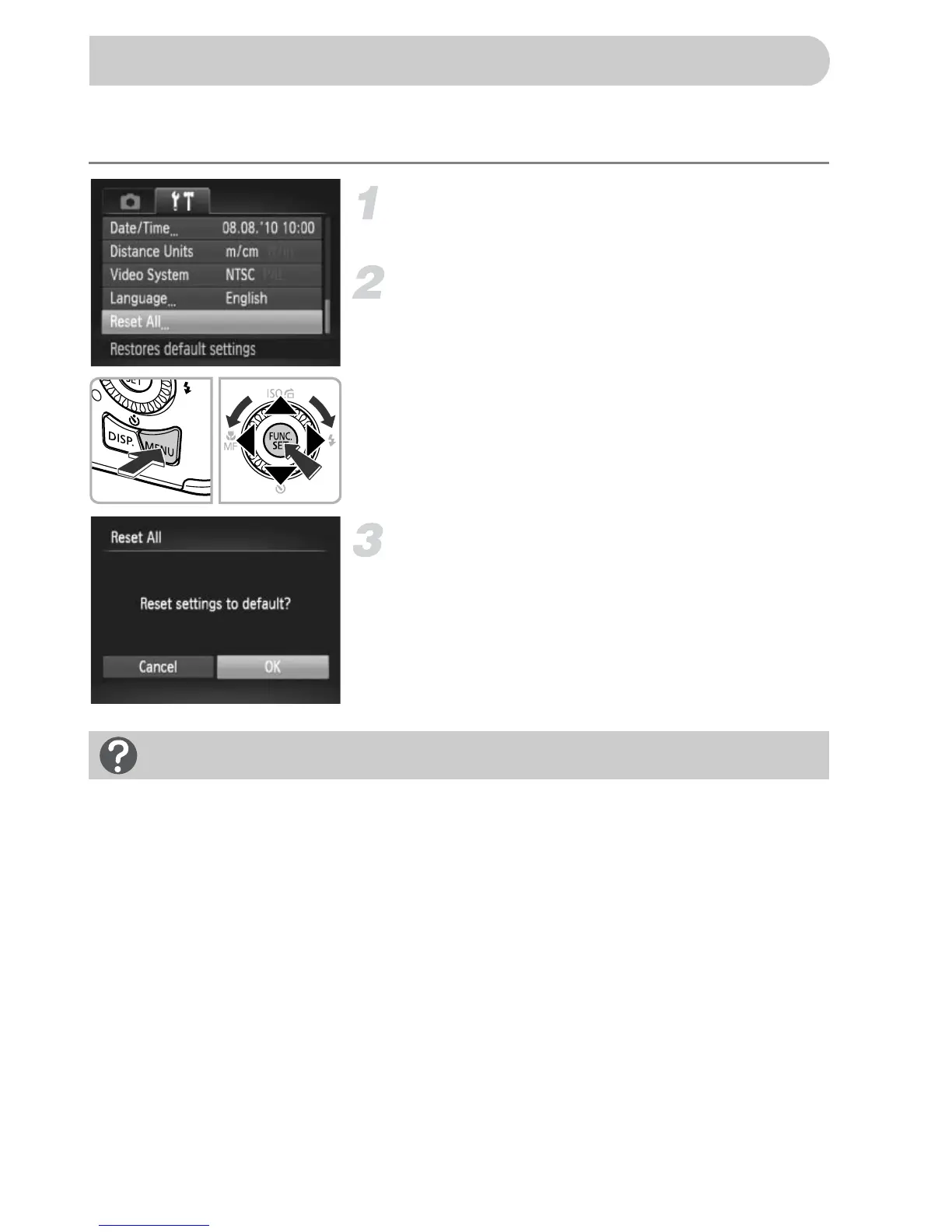 When you have mistakenly changed a setting, you can reset the camera to