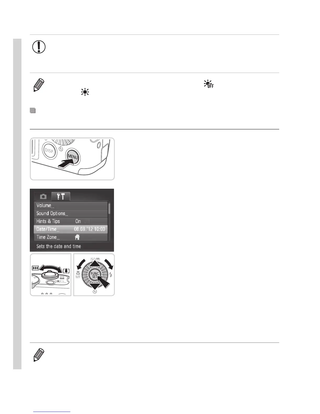 • Ifthe[Date/Time]screenisdisplayedeachtimeyouturnthecameraon,