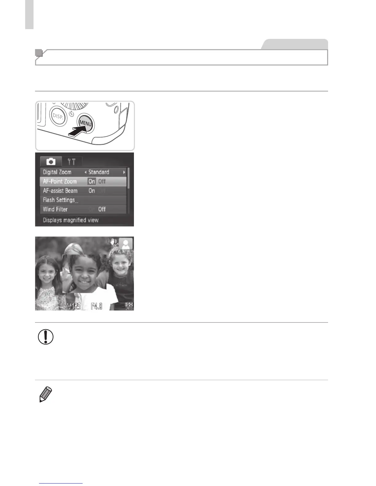 • Theareainfocuswillnotbemagniedwhenyoupresstheshutter