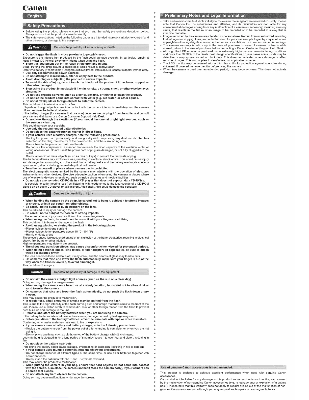 Canon shall not be liable for any damage to this product and/or accidents such as fire, etc., caused