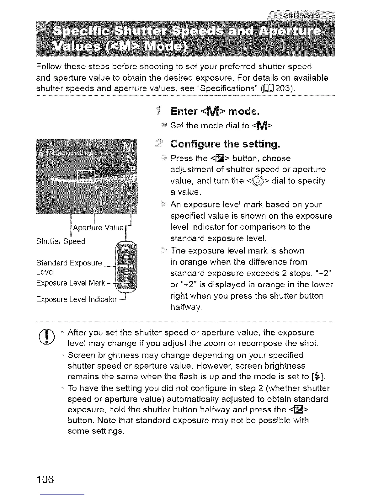 shutter speeds and aperture values, see "Specifications" (_[_203).