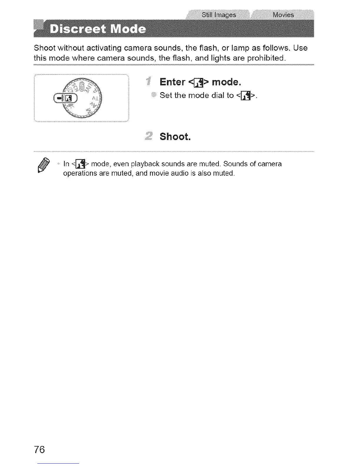 Shoot without activating camera sounds, the flash, or lamp as follows. Use