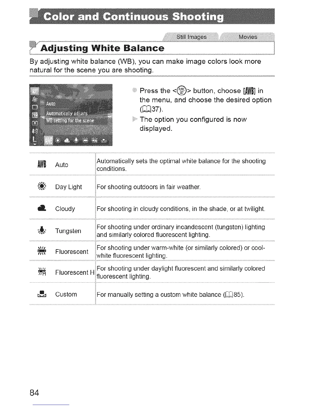 AWB Auto Automatically sets the optimal white balance for the shooting