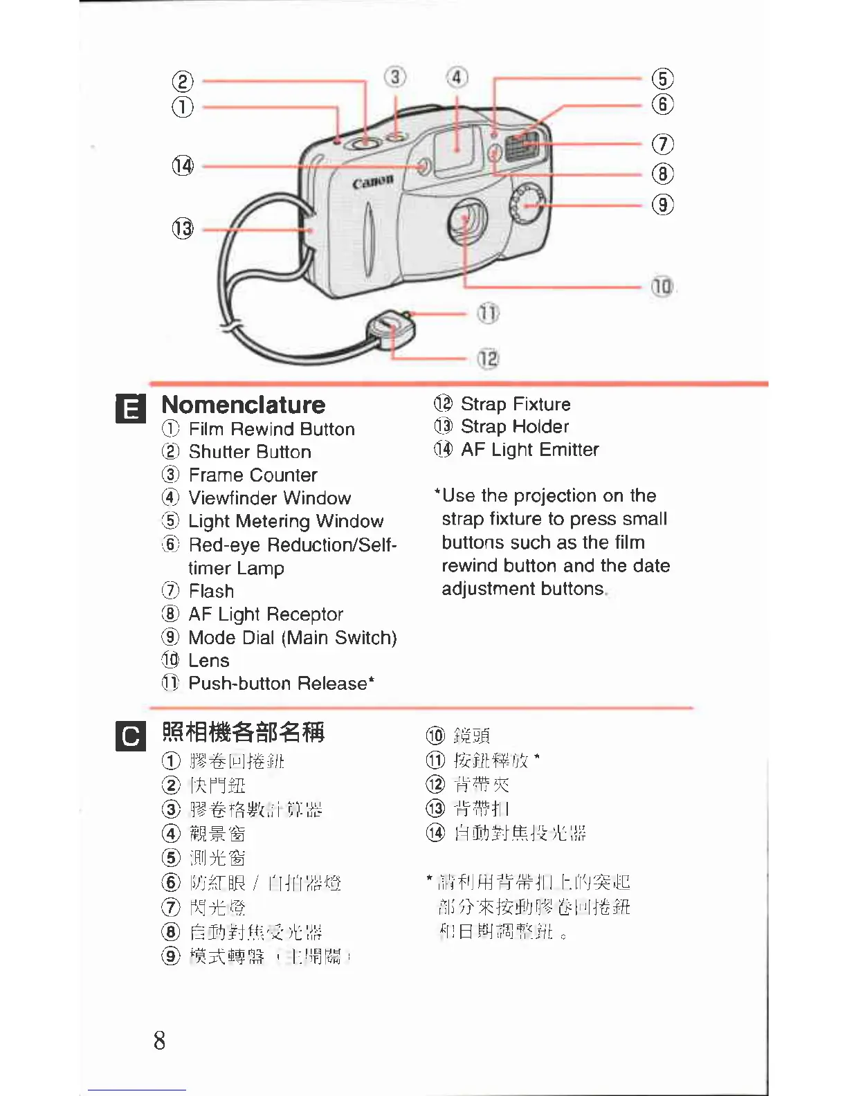 Canon Prima AF-8 Date - Nomenclature Part 1; Film Rewind Button; Shutter Button; Frame Counter