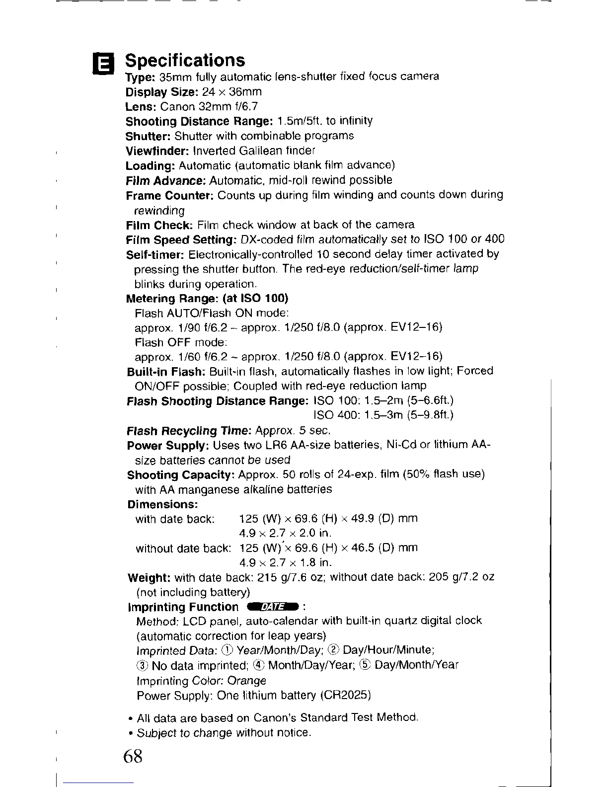 Canon Prima BF-80 Date - Specifications