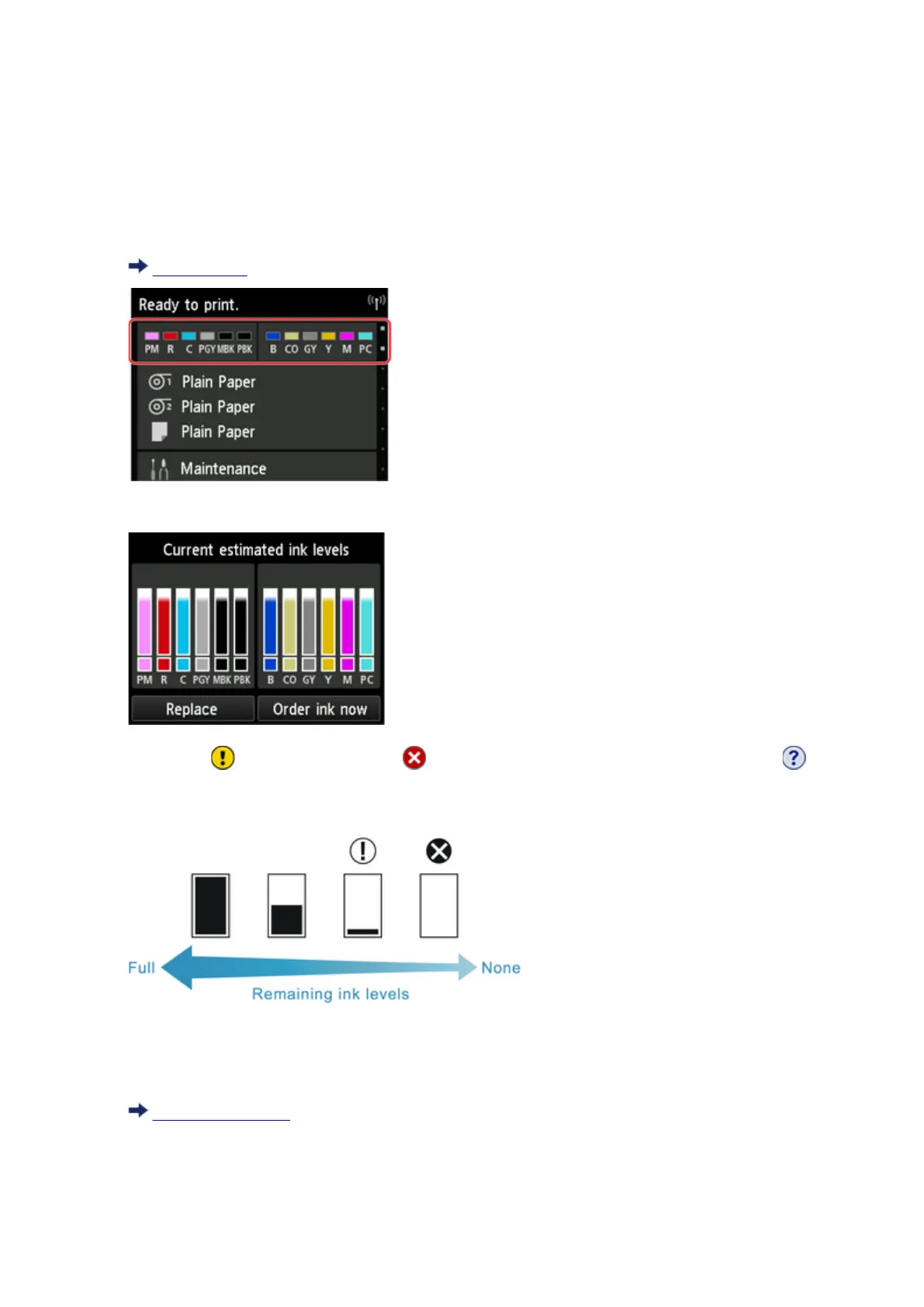 If ink is low, appears; if no ink is left, appears; if you have deactivated ink level detection,