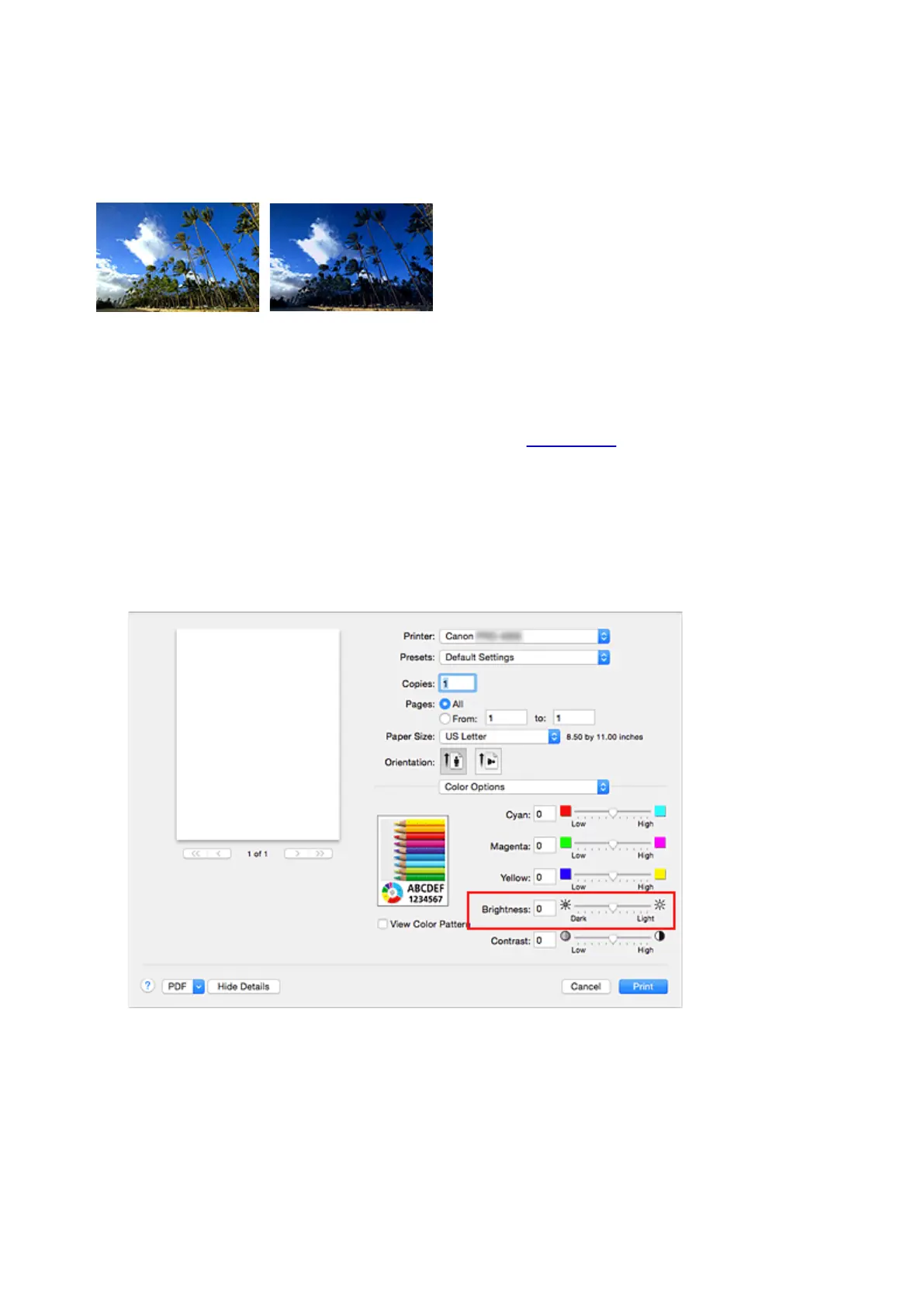 Moving the Brightness slider to the right brightens the colors, and moving the slider to the left darkens