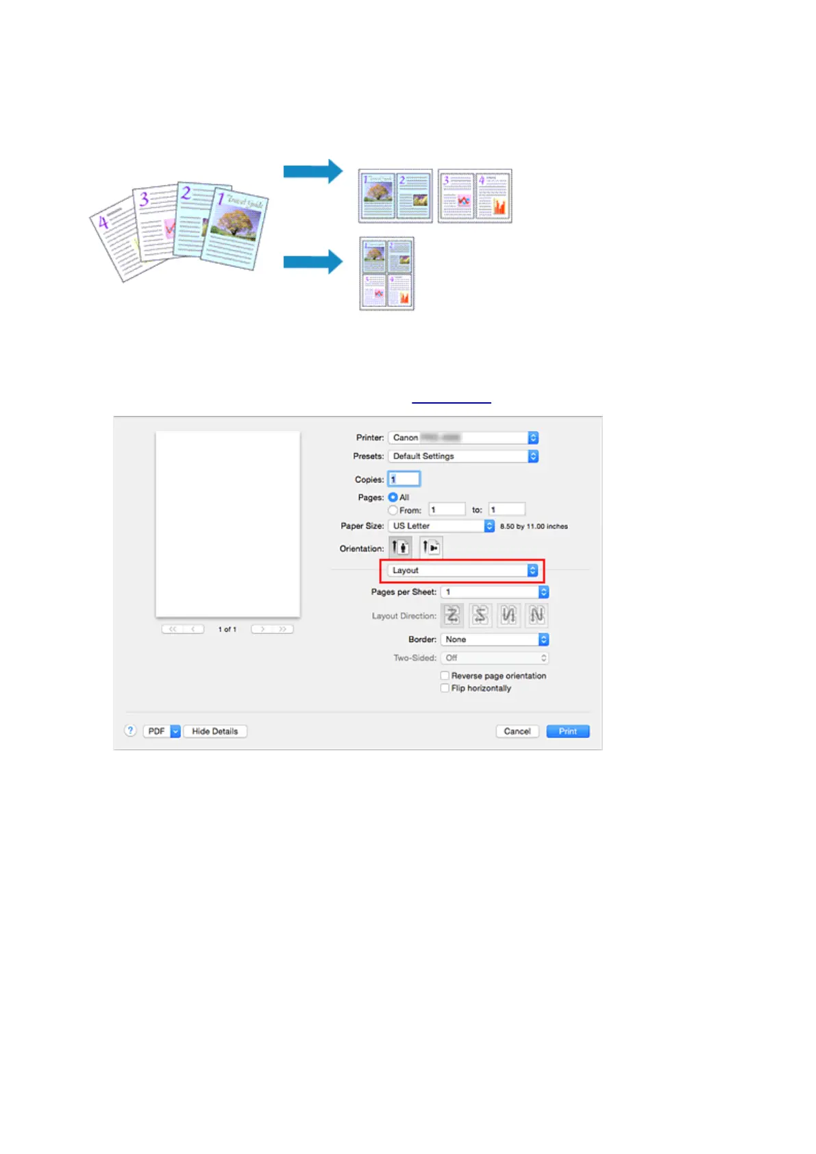 Select Layout from the pop-up menu in the Print Dialog