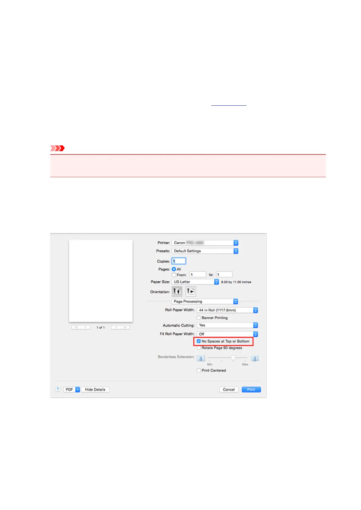 When printing on roll paper, you can save paper by eliminating the upper and lower margins when printing.